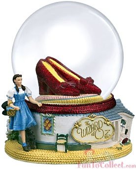 From the Wizard of Oz Collection: Ruby Slippers Water GlobeMade of stone resin; Measures 3" tall; Manufactured by the San Francisco Music Box Company This Oz musical waterglobe features Dorothy's magicical ruby red slippers rotating inside the globe atop a base that pictures Dorothy walking along the yellow brick road. Plays the tune, "Over The Rainbow."