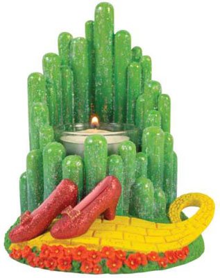 Wizard of Oz Emerald City & Ruby Slippers Tealight Candle Holder. This glittery candleholder measures about 5 inches tall and 4.5 inches wide. Ruby slippers, Yellow Brick Road, Poppies, and the Emerald City decorate this resin tealight candleholder.